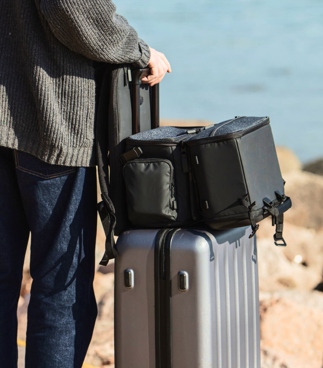 The Gemini can be safely placed on top of your luggage while working on outdoor photography. It won't hinder your ability to quickly access or store all of your camera equipment or laptop from your Gemini.